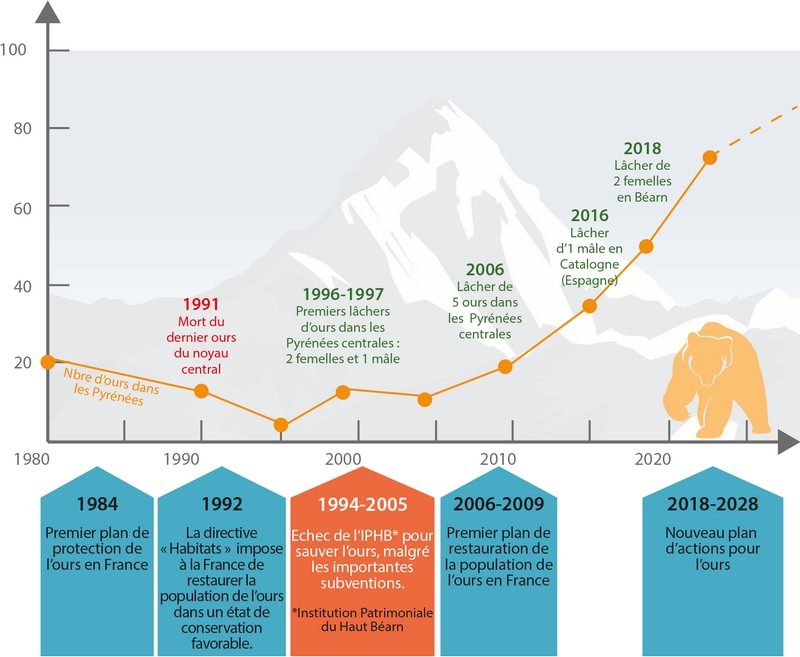 Déclin dû à la destruction jusqu’à la fin du 20ème siècle, puis restauration grâce aux réintroductions.L’ours brun, présent sur l’ensemble du territoire français jusqu’aux alentours de l’an mil, a progressivement disparu sous les effets conjugués du défrichement, de sa destruction et d’une chasse lucrative excessive dont il fut l’objet.